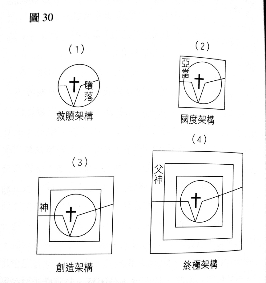 - 1)救赎架构:专注于神为人做了什么—始于人以及人的堕落,终点是人得救赎和上天堂。2)国度架构:起点就是亚当在伊甸园里作王,而终点是人类在地上作宇宙的王。此架构只限于在地上建立神的国度和祂的公义,其目标专一于一个更宽泛的神终极计划的主题,即神在地上的国度;但这个主题被过于强调和重申,变成了以人为中心。3)创造架构:始于创世纪中神作为创造者,他们为了这个庞大创造寻求意义和理由。但这个架构终止于人要被模成神的形像,并且最终享受神在一个「新造」(罗8:19-22;创21:5)所预备的一切—虽然这是个更大的架构,其专注点却只在于人将会从神得到什么。4)终极架构:这个架构的起点是神为父的心,这是创立世界以前所有起因的源头,神为父的身份和本性决定了祂所切切要得着的、祂的永恒目的,祂的至高专注点,以及祂目标的最终实现,好叫父神的心得着满足,而这个满足是祂那为父的心所十分配得的。以永在的父为起点,而以神庞大的族类为终点,并且这个族类使父神和祂永远的儿子得着尊贵、荣耀、喜悦和满足。还有什么架构比这更大呢?