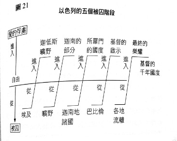 上图画出以色列历史的5个阶段,她5次被拯救而进入神圣命运,但是5次都瞎了心眼,不了解神终极的心意而又进入另一阶段的被囚光景。